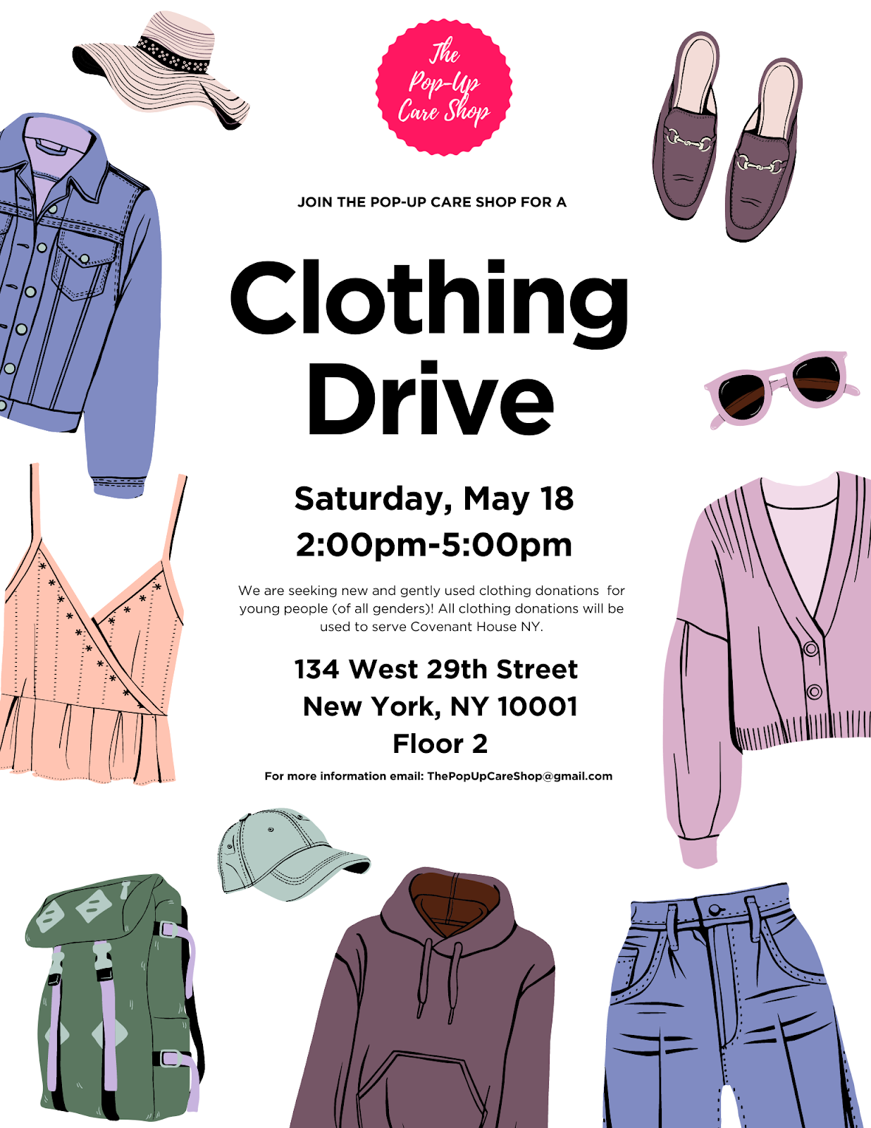 We are hosting a one-day-only clothing drive event in New York, NY this coming Saturday, May 18th from 2pm – 5pm. You can find us at 134 W 29th St, New York, NY 10001, USA, Floor 2. See flyer below.