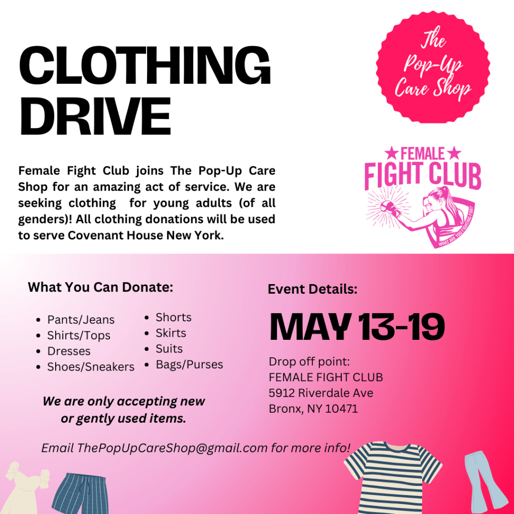 We are so excited to partner with Female Fight Club for an upcoming clothing drive! From May 13-19, Female Fight Club will be collecting clothing donations to help support our upcoming Care Shop for the youth of Covenant House New York.