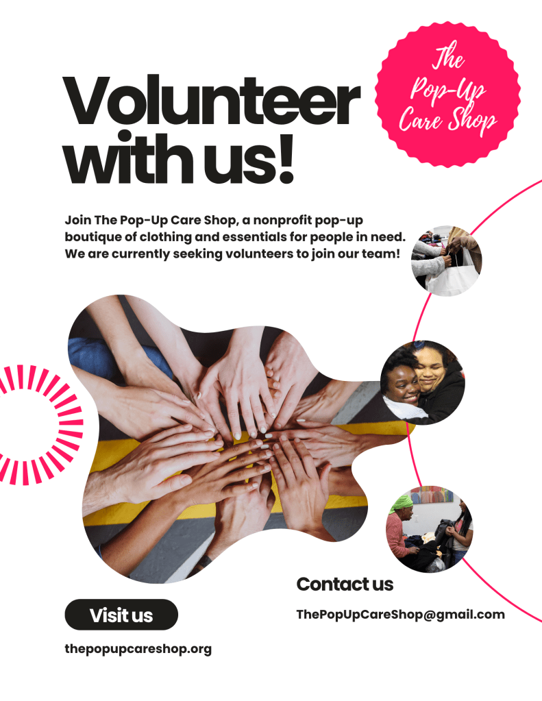 We are always looking to grow our volunteer network. Whether you’d like to sign up for an upcoming event or be a part of our core team (helping with planning Care Shops, fundraising, etc.), we welcome you! Email us at thepopupcareshop@gmail.com for inquiries.